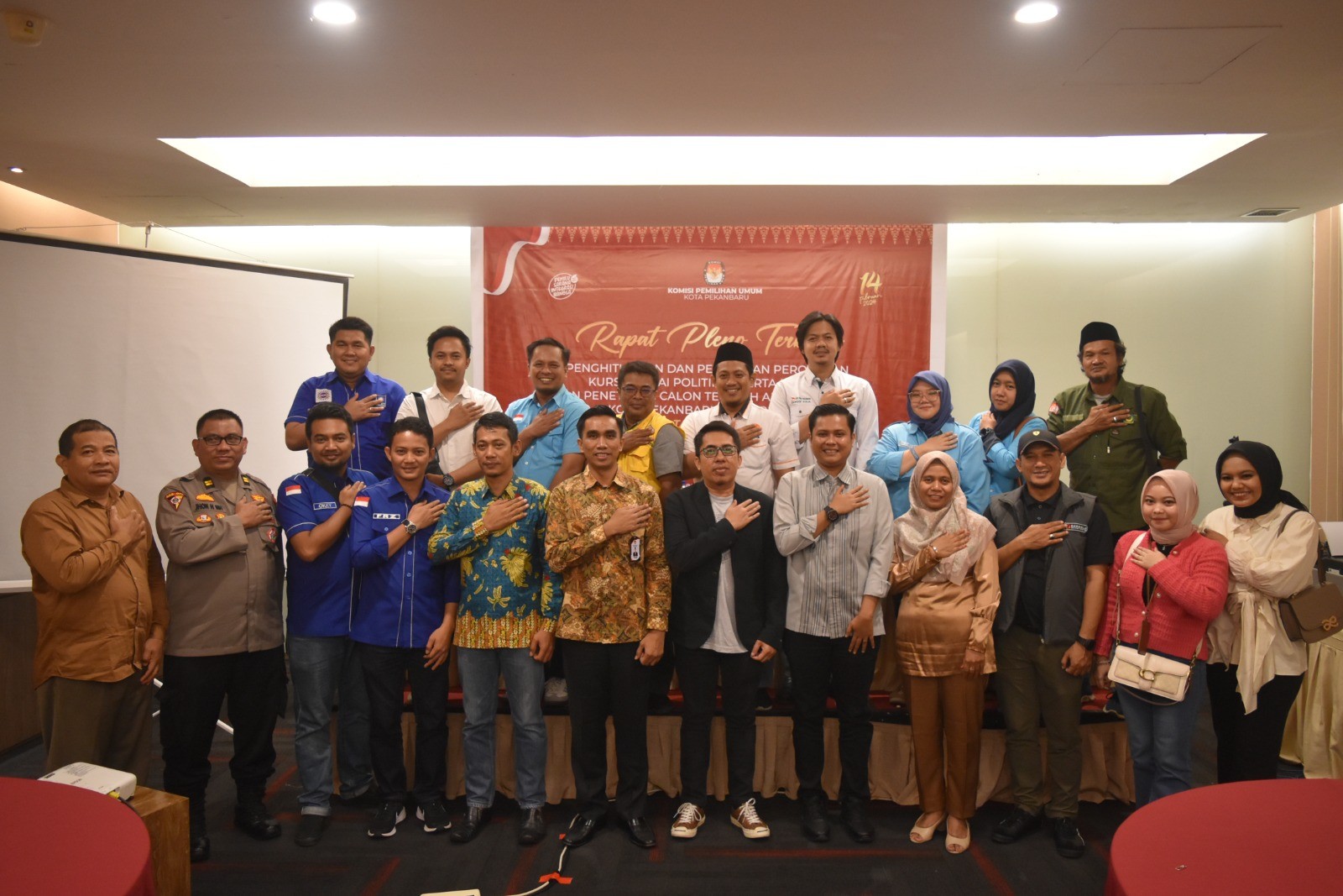 KPU Kota Pekanbaru Tetapkan 50 Calon Terpilih Anggota DPRD Kota Pekanbaru Pada Pemilu Tahun 2024 Komisi Pemilihan Umum (KPU) Kota Pekanbaru menetapkan perolehan kursi dan calon legislatif (Caleg) terpilih dalam Pemilihan Umum (Pemilu) tahun 2024, Kamis (02/05/2024) malam di Hotel Premier. Dalam rapat pleno terbuka tersebut, KPU Pekanbaru menetapkan 50 kursi anggota DPRD Pekanbaru terpilih dengan perolehan suara dan parpol masing-masing. Pleno dipimpin Ketua KPU Pekanbaru Raga Perwira didampingi anggota Rizqi Abadi, Salmon Daliyoto dan Siti Syamsiah. Hadir juga Ketua Bawaslu Kota Pekanbaru, Ferdy SIP dan anggota Misbah Ibrahim, kepolisian dan perwakilan partai politik. "Alhamdulillah kita sudah selesai menggelar rapat pleno terbuka penghitungan dan penetapan perolehan mursi partai politik peserta pemilu dan penetapan 50 calon terpilih anggota DPRD Kota Pekanbaru periode 2024-2029 pada Pemilu tahun 2024. Pleno berjalan lancar," kata Ketua Divisi Sosialisasi, Pendidikan Pemilih, Partisipasi Masyarakat dan SDM KPU Pekanbaru, Rizqi Abadi S.Ikom. Dikatakan rapat pleno terbuka penetapan perolehan kursi dan calon terpilih dalam pemilihan umum tahun 2024 tingkat KPU Pekanbaru digelar setelah KPU menerima surat dari Mahkamah Konstitusi terkait jawaban surat KPU RI mengenai registrasi perkara Perselisihan Hasil Pemilihan Umum (PHPU). "Pekanbaru merupakan satu dari tujuh daerah di Riau yang tidak mengajukan perkara PHPU ke MK. Makanya kita diminta untuk menggelar rapat pleno terbuka penetapan perolehan kursi dan calon terpilih dalam pemilihan umum tahun 2024 paling lambat tiga hari setelah KPU menerima surat dari MK," kata mantan Anggota Bawaslu Pekanbaru dua periode tersebut. Adapun calon terpilih DPRD Kota Pekanbaru periode 2024-2029 setiap Daerah Pemilihan (Dapil) dan partai politik serta jumlah perolehan suara masing-masing calon terpilih adalah sebagai berikut: Dapi Pekanbaru 1 1. Rizky Bagus Oka (Gerindra) 2. Viktor Parulian (PDIP) 3. Roni Amriel (Golkar) 4. Muhammad Isa Lahamid (PKS) 5. Nofrizal (PAN) 6. Muhammad Zahirsyah (Demokrat) Dapil Pekanbaru 2 1. Andry Saputra (Gerindra) 2. Zulkardi (PDIP) 3. Syamsul Bahri (Golkar) 4. Lindawati (Nasdem) 5. Firmansyah (PKS) 6. Irman Sasrianto (PAN) 7. Aidil Amri (Demokrat) Dapil Pekanbaru 3 1. H Ervan (Gerindra) 2. Muhammad Dikky Suryadi Khusaini (PDIP) 3. Sovia Septiana (Golkar) 4. Muhammad Rizki Rinaldi (Nasdem) 5. Muhammad Sabarudi (PKS) 6. Zulfahmi (Hanura) 7. Arwinda Gusmalina (PAN) 8. Heri Setiawan (Demokrat) Dapil Pekanbaru 4 1. Sri Rubianti (Gerindra) 2. Zakri Fajar Triyanto (PDIP) 3. Putri Varadina (Golkar) 4. Meiza Ningsih (PKS) 5. Firman (Hanura) 6. T Azwendi Fajri (Demokrat) Dapil Pekanbaru 5 1. FikrFikry Rayhan Ramadhana (PKB) 2. Nurul Ihsan (Gerindra) 3. Tekad Indra Pradana Abidin (PDIP) 4. Faisal Islami (Nasdem) 5. Hamdani (PKS) 6. Mona Sri Wahyuni (PAN) 7. Niar Erawati (Demokrat) Dapil Pekanbaru 6 1. Abu Bakar (PKB) 2. Zainal Arifin (Gerindra) 3. Davit Marihot Silaban (PDIP) 4. Syafri Syarif (Golkar) 5. Zulfan Hafiz (Nasdem) 6. Yasser Hamidi (PKS) 7. Edi Azhar (PKS) 8. Roni Pasla (PAN) 9. Pangkat Purba (Demokrat) 10. Achmad Faisal Reza (Demokrat) Dapil Pekanbaru 7 1. Wan Agusti (Gerindra) 2. Robin Eduar (PDIP) 3. Aidhil Nur Putra (Nasdem) 4. Rois (PKS) 5. Doni Saputra (PAN) 6. Jepta Sitohang (Demokrat) Seperti diketahui, jumlah kursi di DPRD Pekanbaru bertambah lima kursi dari 45 kursi menjadi 50 kursi. Penambahan itu seiring bertambahnya jumlah penduduk Kota Pekanbaru yang saat ini mencapai di atas 1 juta jiwa. Tepatnya 1.074.246 jiwa.